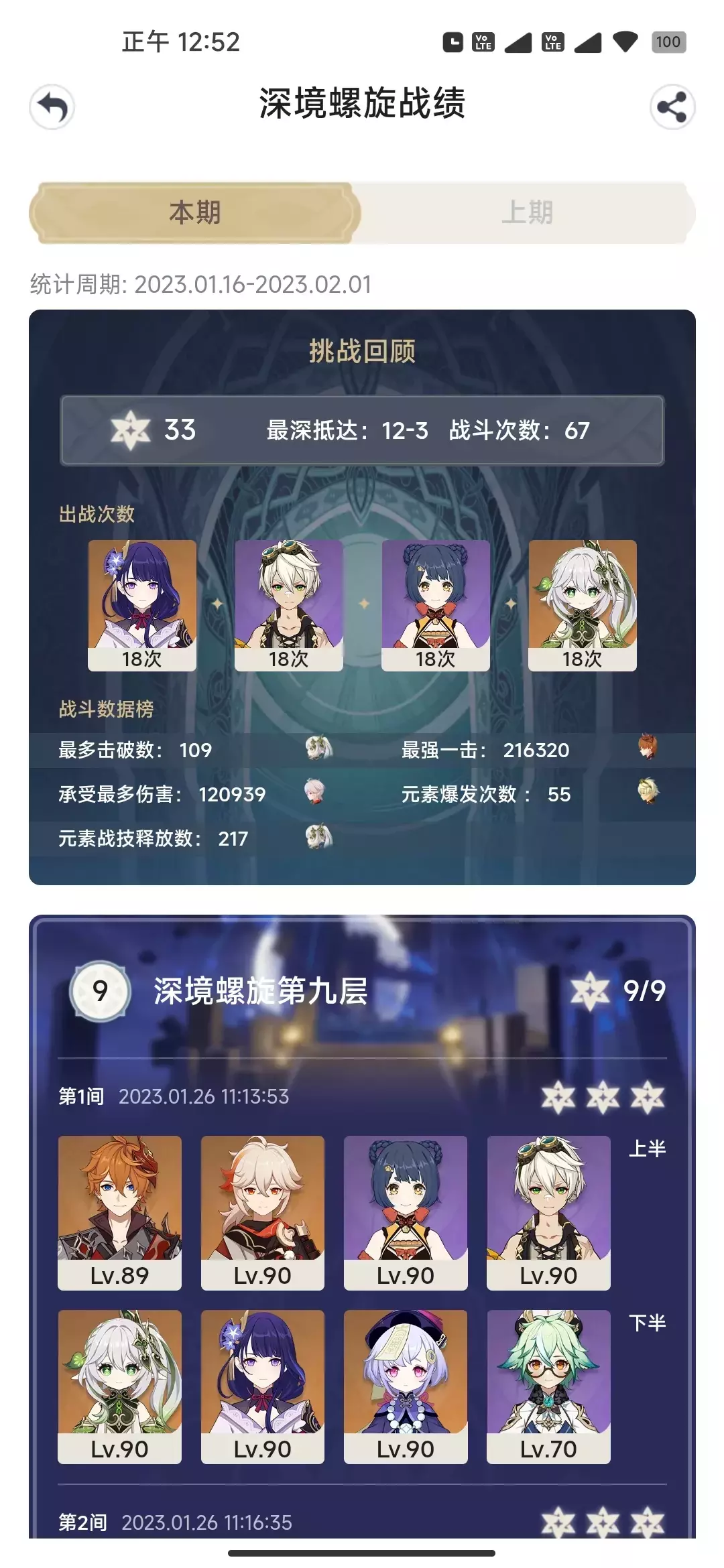 前前后后凹了有 100+ 次,不过由于前面几十次是在尝试配队,有了第一期经验后,16 号的深渊应该也能轻松不少。