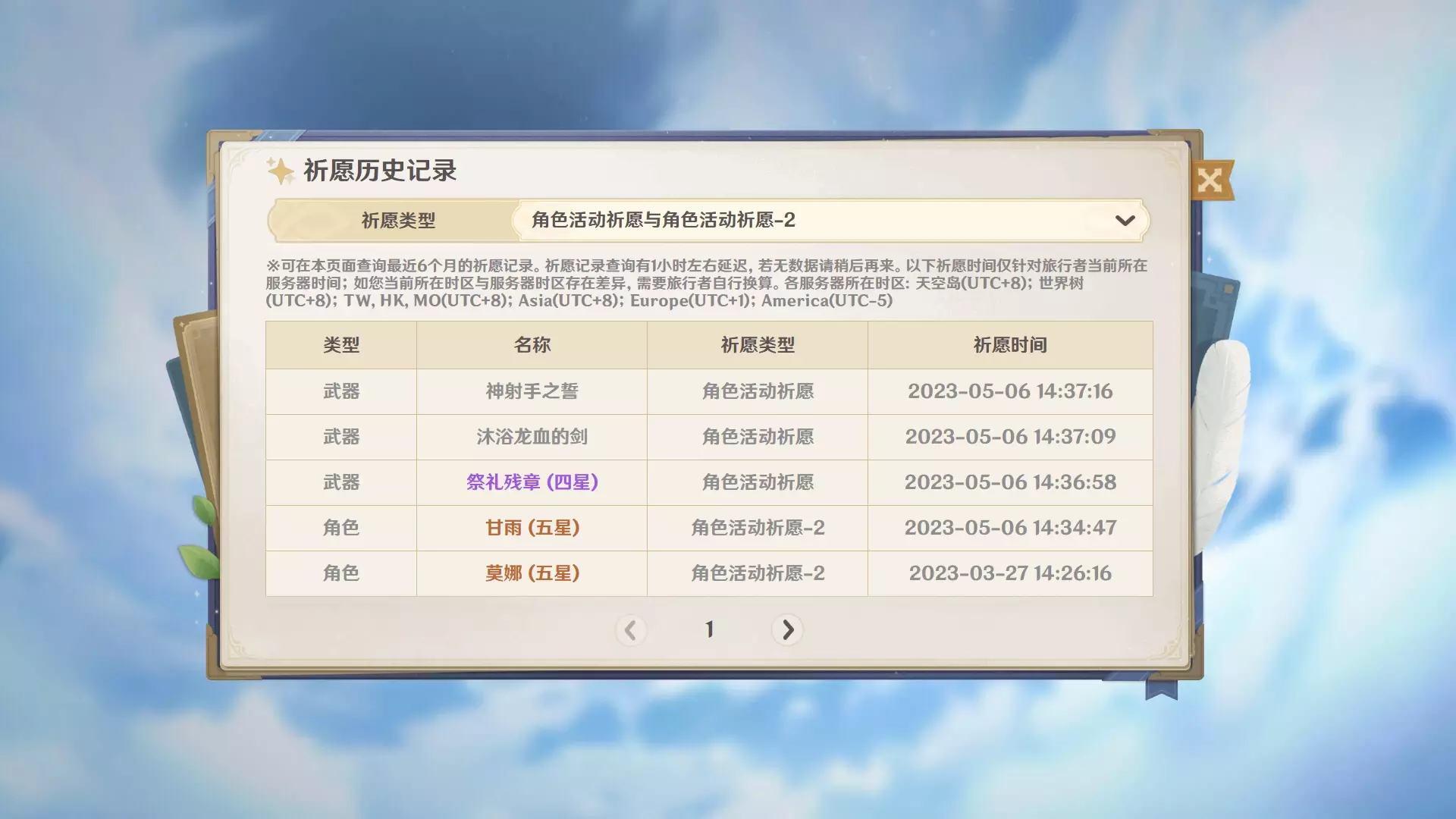 今天闲来无事,想起了这个号,上号后拿着版本送的原石单抽了一发,本来以为出紫了,结果出金了!于是甘雨拿下~