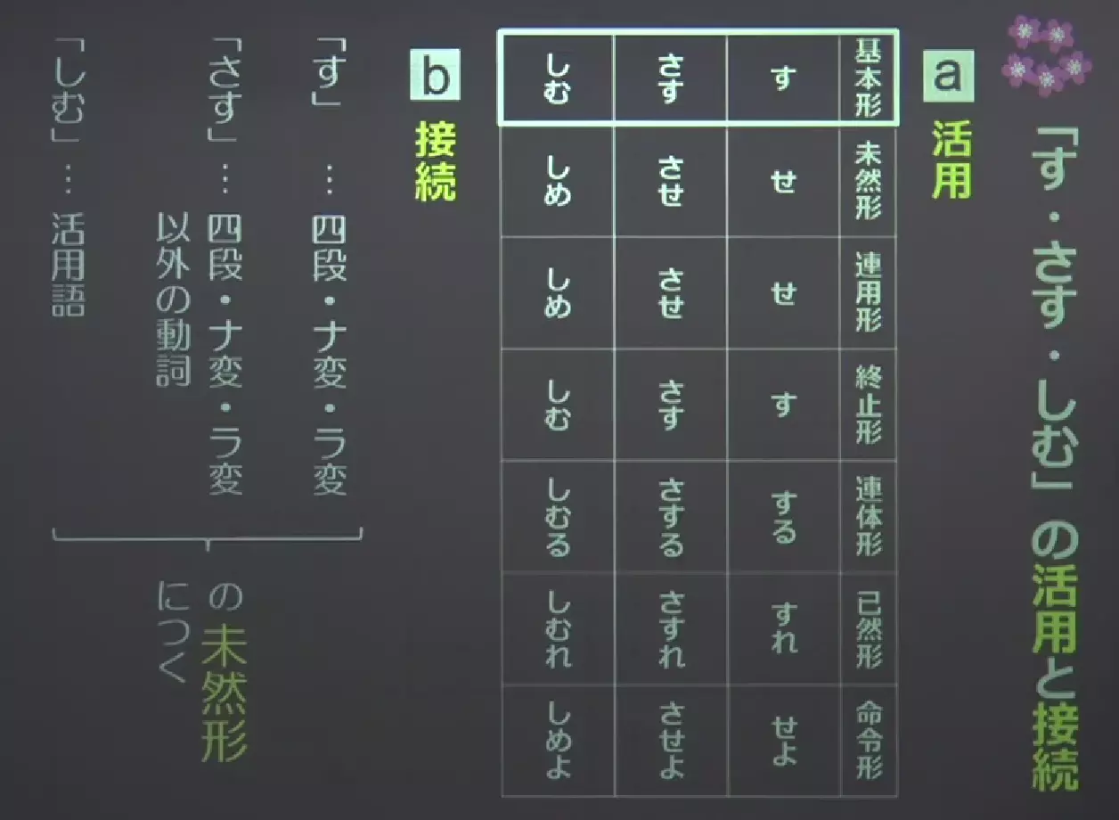 接续:前接未然形。す前续四段动词,ナ变动词,ラ变动词的未然形,さす前续非「四段动词,ナ变动词,ラ变动词」的未然形,しむ则没有限制,只要是活用语的未然形都可以接