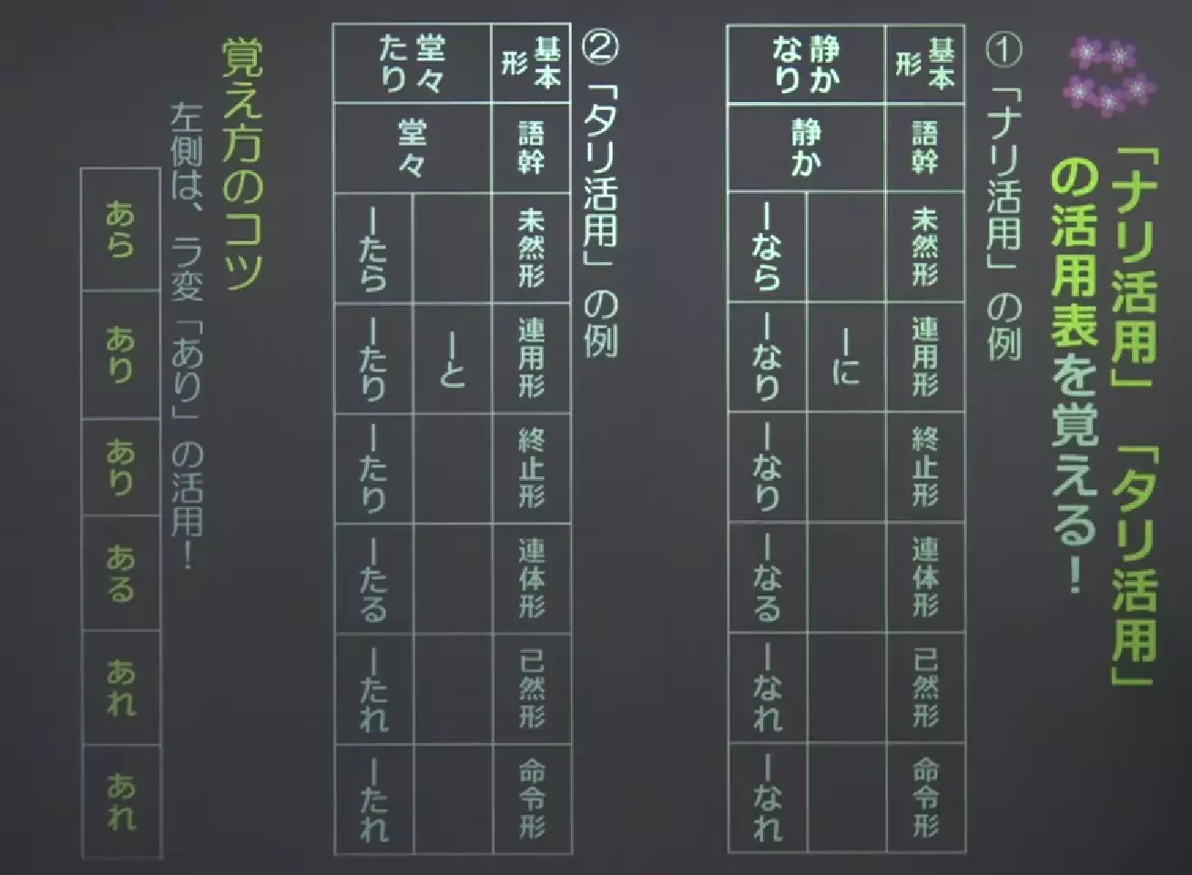 形容动词有「なり」「たり」两种活用,两种活用除了「と」「に」的连用形较为特殊,其余均与ラ变动词「あり」的活用方式一致,因此活用词尾「たり」「なり」属于ラ变形