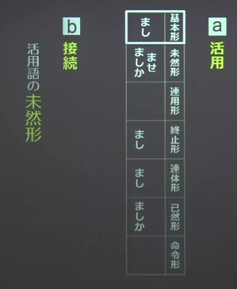 - 反实假想:反实假想按字面意思理解即「做出与现实相反的假设」,暗含「实际上不是这样」的意思。翻译为现代日语即为「もし~ならば、~であろうのに」。以「~せば~まし」「~ませば~まし」「~ましかば~まし」「未然形 + ば~まし」的形式出现,其中「~せば~まし」的 「せ」是表示过去的助动词「き」的未然形,见【笔记·古典日语】助动词「き·けり」
