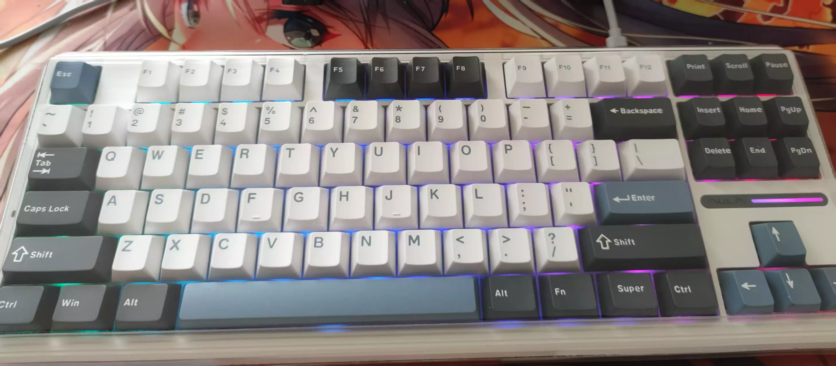 好了,番剧就聊到这里,换个话题吧。最近用了 4 年的惠普键盘终于退役了,长期的暴力使用,让 w 键接触不灵了,按照网上的方法用针清理了下轴体,但无济于事,加上这款键盘不支持换轴,基本宣告废了。于是看了一下 b 站 up 主的推荐,但似乎都是恰米的,又逛了几天评论区,发现狼蛛这个牌子的口碑还不错,然后之前用的似乎是 104 键的,桌子太小,即使把键盘斜过来,打游戏的时候还是经常和鼠标发生碰撞,于是这回想买个 87 键位的。最终决定下单狼蛛的 F87 Pro 灰木轴,到手后发现手感确实比原来那款要好不少,然后声音清脆的同时晚上也不会太吵,用来打字还是比较舒服的,咱也是奢侈一把,用上蓝牙的机械键盘了。不会告诉你使用京东白条后到手价 125
