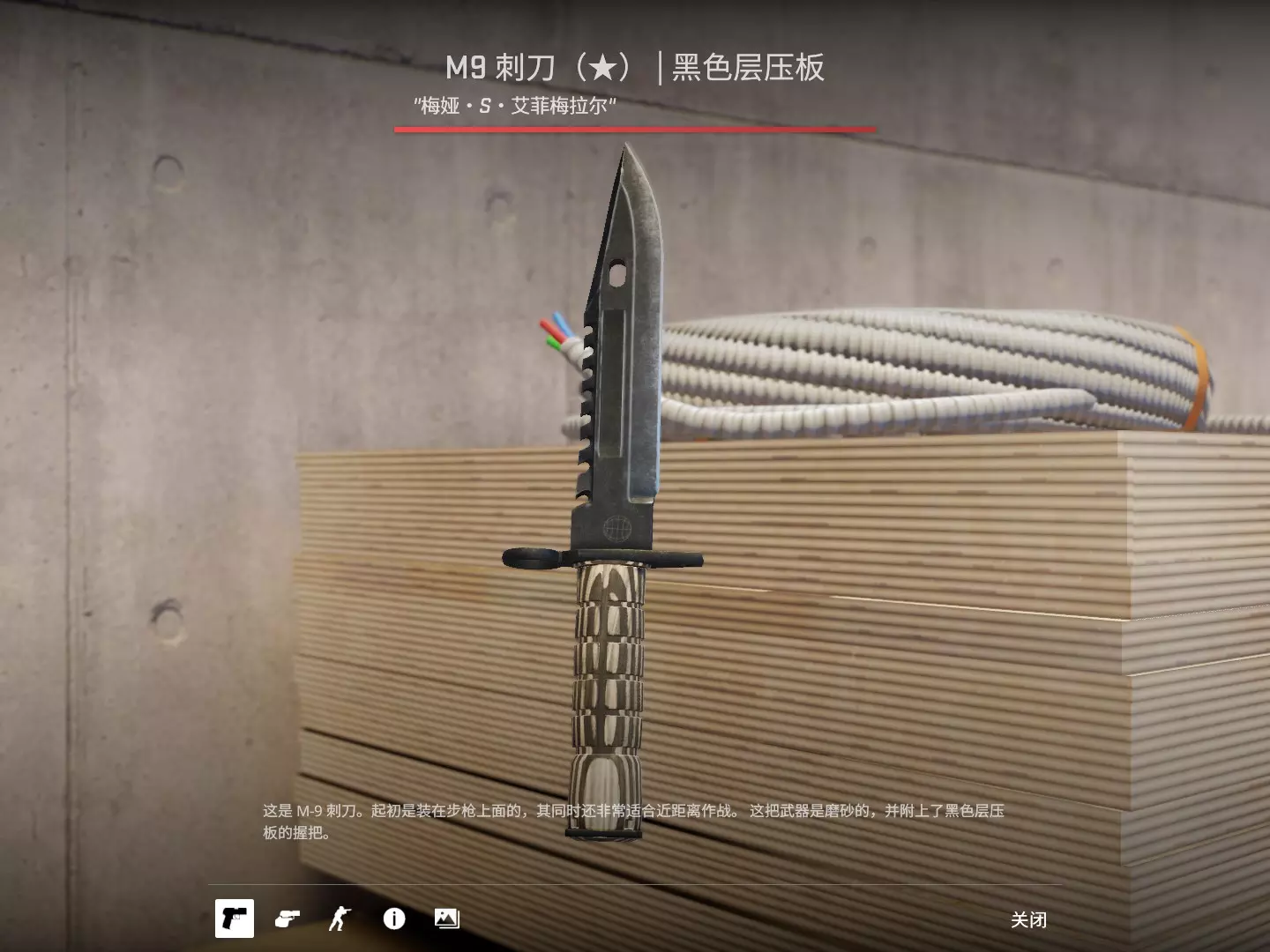 跨年前又换了把新刀,不得不说 m9 切刀手感是真的不错,确实和传言一样,有一种厚重感。一开始我是比较嫌弃这把刀的外观的,因为感觉没什么特色,像 cf 里的默认小刀。不过在社区服检视了几天,突然觉得顺眼起来了,最后选了个不怎么吃磨损的黑压,虽然不吃磨损,但还是捡漏捡到了低价极限酒精,以后玩腻了出的时候也能更好出一点吧。然后把刀名改成了梅娅,其实感觉把死神 awp 改成梅娅的名字更合适一点,毕竟梅娅也是死神,不过我死神买的酒精的,太便宜了,不值得用名称标签,而且我更喜欢这把刀。